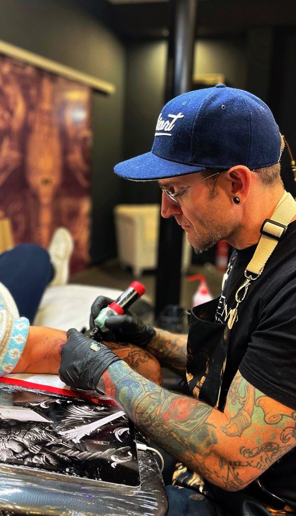 Mi carrera se consolidó en Berlín, en CNX Tattoo, donde me formé como tatuador profesional y obtuve numerosos premios y reconocimientos internacionales. Además, he colaborado como juez en convenciones en países como Colombia, Italia, Alemania, México y España, y he participado en proyectos artísticos destacados, como el cartel del 25º Aniversario de la Convención Internacional de Tatuajes de Berlín. Durante mi trayectoria, he contado con el respaldo de importantes marcas en el mundo del tatuaje, actualmente Cheyenne (Alemania), Radiant Colors Ink (USA), Ink Booster (Austria) y Emalla (China).